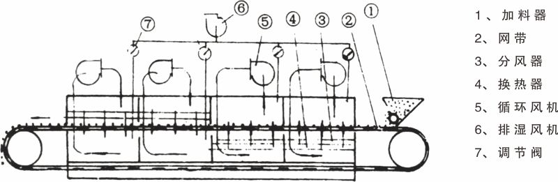 工作原理如圖所示,料斗中的物料由加料器均勻地鋪在網帶上,網帶采用12-60目不銹鋼絲綱,由傳動裝置拖動在干燥機內移動,干燥機由若干單元組成,每一個單元熱風獨立循環,其中部分尾氣由專門排濕風機6排出,第一單元排出廢氣量均有調節閥7控制。在上循環單元中,循環風機5出來的風由側面風道進入單元下腔,氣流向上通過換熱器4加熱,并經分配器6分配后,成噴射流吹向綱帶,穿過物料后進入上腔。干燥過程是熱氣流穿過物料層,完成熱量與質量的過程。上腔由風管與風機入口相連,大部分氣體循環,一部分先進入上腔,向下經換熱器加熱,穿過物料層進入下腔,下腔由側面風道及回負管與風機入口相連,大部分氣體循環,一部分排出。下循環單元根據用戶需要可靈活配備,單元數量亦可根據需要選取。